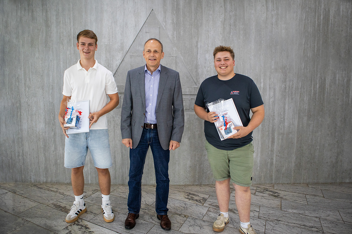 Rotthalmünster. Die Firma Meier Bau freut sich über zwei frisch ausgebildete Nachwuchskräfte. Fabian Brandl (l.) als Industriekaufmann und Finn Danninger (r.) als Baustoffprüfer haben jeweils die Ausbildung erfolgreich abgeschlossen und verstärken auch weiterhin das Meier Bau-Team. Geschäftsführer Rudolf Schmalhofer gratulierte beiden Absolventen persönlich und lobte ihre hervorragenden Leistungen und ihr Engagement in den vergangenen Jahren. Als Zeichen der Anerkennung überreichte er jedem eine Urkunde sowie ein kleines Geschenk. „Gut ausgebildete Fachkräfte sind die Grundlage für unseren Erfolg. Wir sind sehr stolz darauf, dass unsere Auszubildenden ihre Ausbildung mit so großem Einsatz abgeschlossen haben und freuen uns umso mehr, dass sie weiterhin Teil unseres Teams bleiben“, betonte der Geschäftsführer.