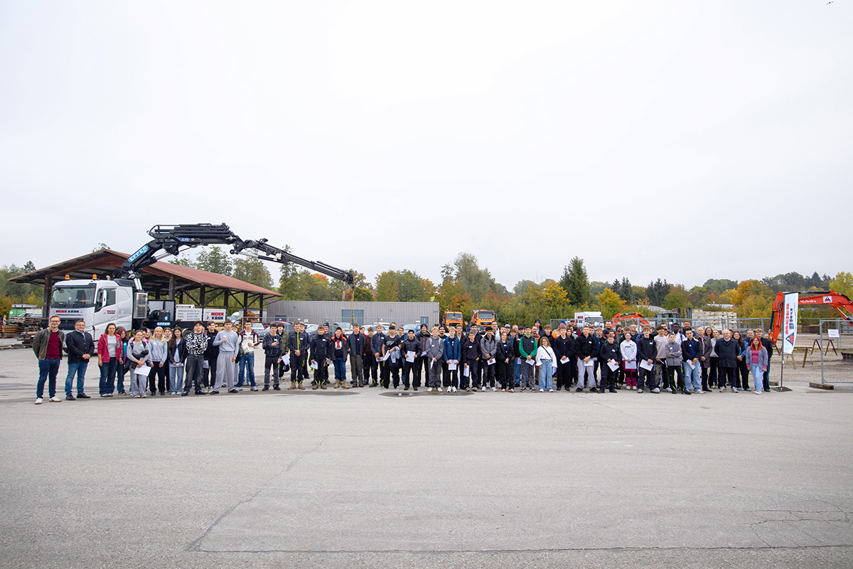 Bildunterschrift. Bauberufetag 2025: Gesellschafter Vinzenz-Klaus Obermeier-Arnold, Geschäftsführer Rudolf Schmalhofer sowie Prokurist Thomas Köhler mit den Schülerinnen und Schülern und dem Meier Bau-Team.